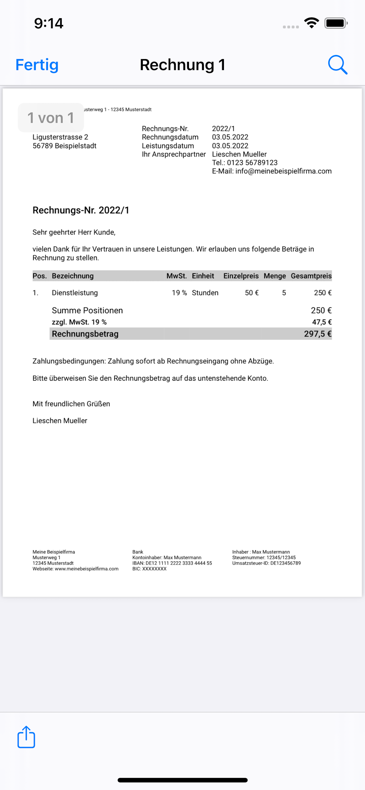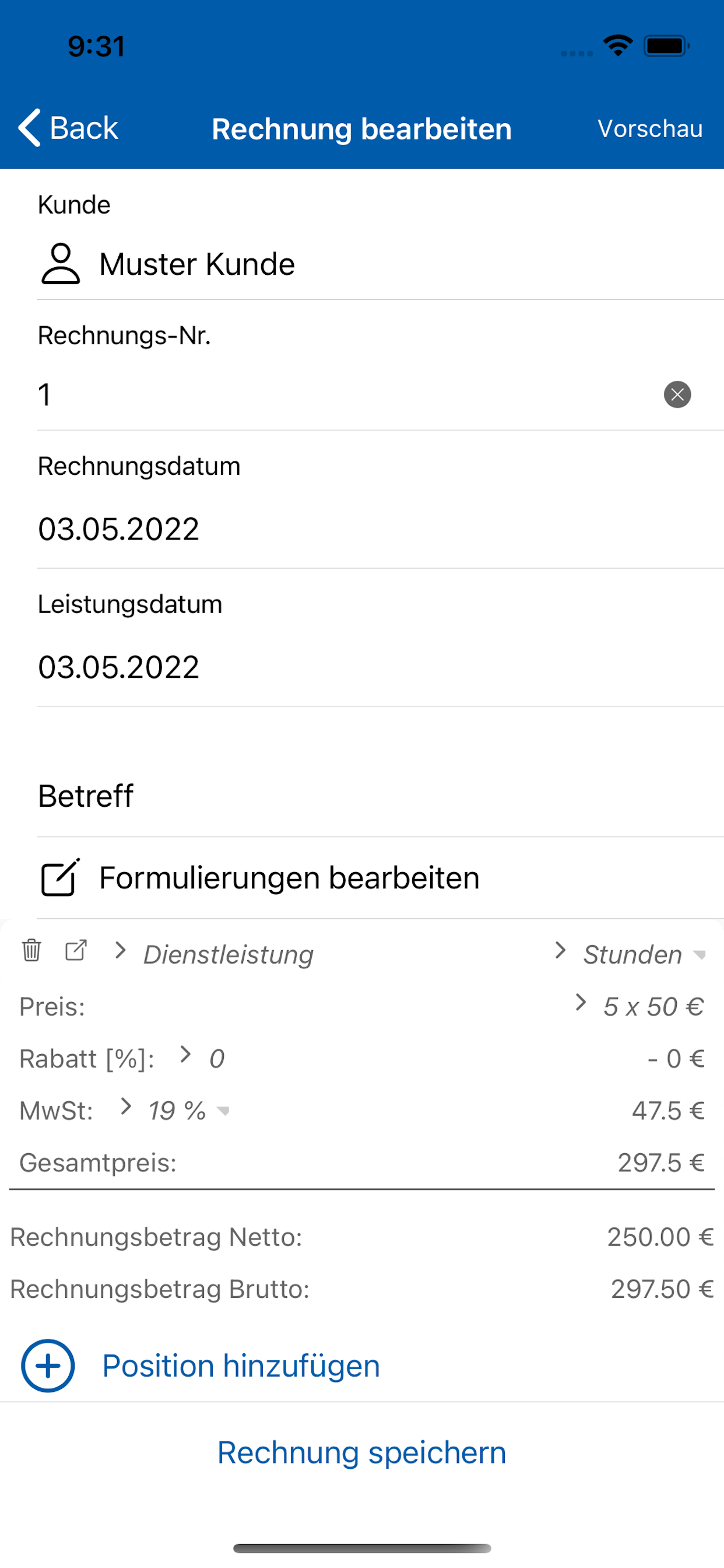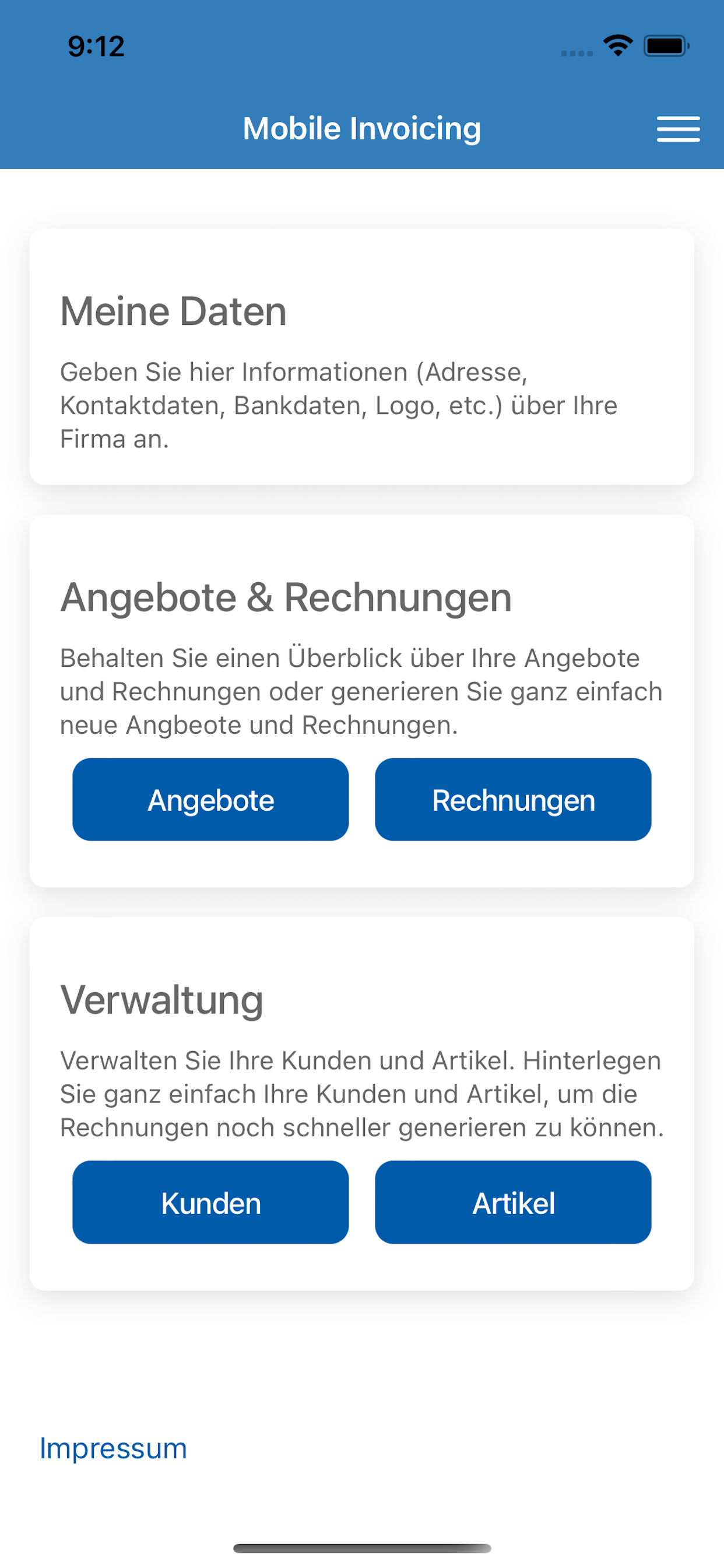 Ihre Kontaktdaten und Artikel bzw. Leistungen sowie die Kontaktdaten Ihrer Kunden können Sie in Mobile Invoicing hinterlegen. Ihre Angebote und Rechnungen können Sie dann in nur wenigen Klicks generieren, indem Sie auf die hinterlegten Daten zugreifen.